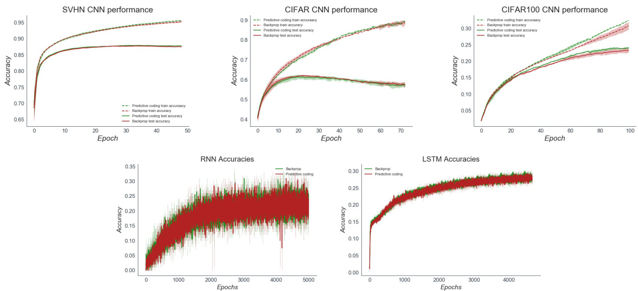 图 3: 上排: 预测编码 (predictive coding) 和反向传播 (backprop) CNN 在 SVHN、CIFAR10 和 CIFAR10 数据集上经过 5 次随机种子运行的训练与测试准确率曲线。下排: 预测编码和反向传播 RNN 及 LSTM 的训练与测试准确率曲线。两者性能基本无法区分。由于需要迭代直至收敛,预测编码网络的计算成本约为反向传播网络的 $100\mathrm{x}$ 倍。