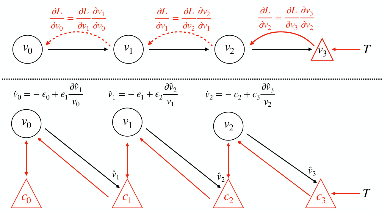 Figure 1: Top: Back propagation on a chain. Backprop proceeds backwawrds sequentially and explicitly computes the gradient at each step on the chain. Bottom: Predictive coding on a chain. Predictions, and prediction errors are updated in parallel using only local information.
