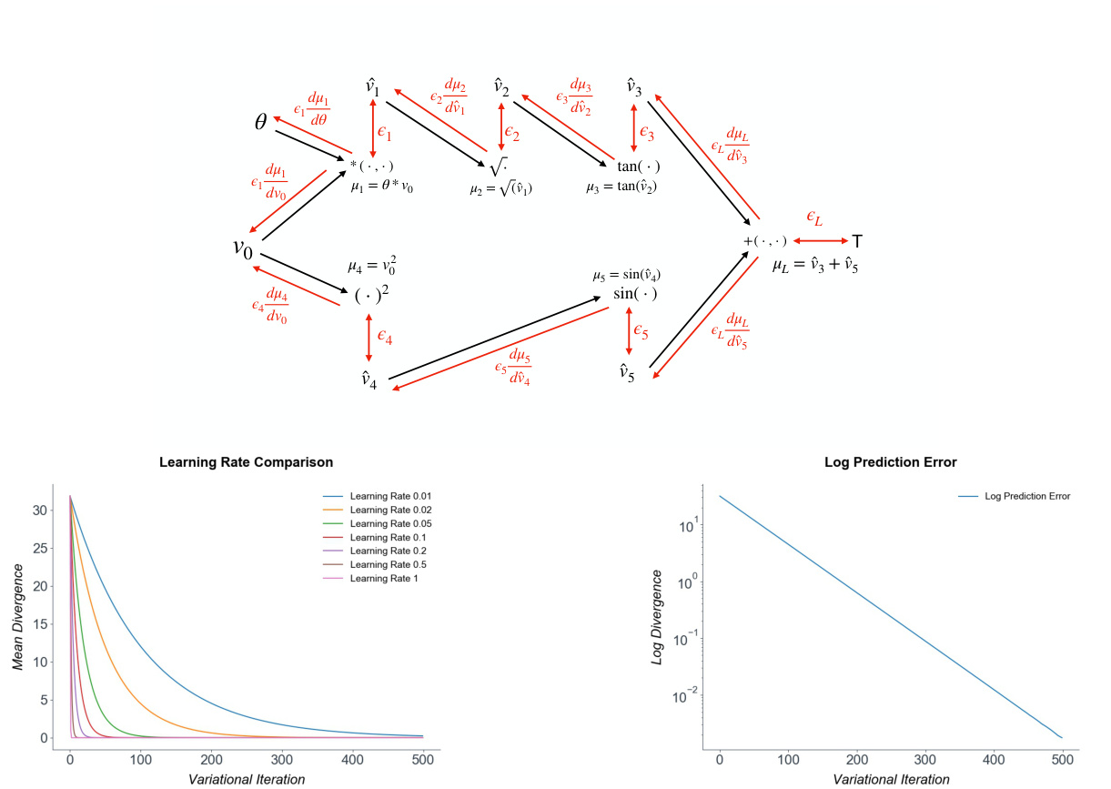 图 2: 上: 非线性测试函数 $v_{L}=\tan(\sqrt{\theta v_{0}})+\sin(v_{0}^{2})$ 的计算图。下: 不同学习率下对数平均散度与真实梯度的散度对比图。梯度收敛呈指数级且对高学习率具有鲁棒性。