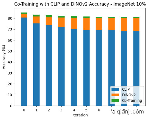 Figure 3. Top-1 accuracy of co-training iterations on the CLIP and DINOv2 views for the ImageNet $10%$ dataset.