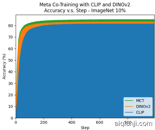 图 4: 使用CLIP和DINOv2视图进行元协同训练的效果随训练步骤变化。模型在10%的ImageNet标签数据上进行训练。