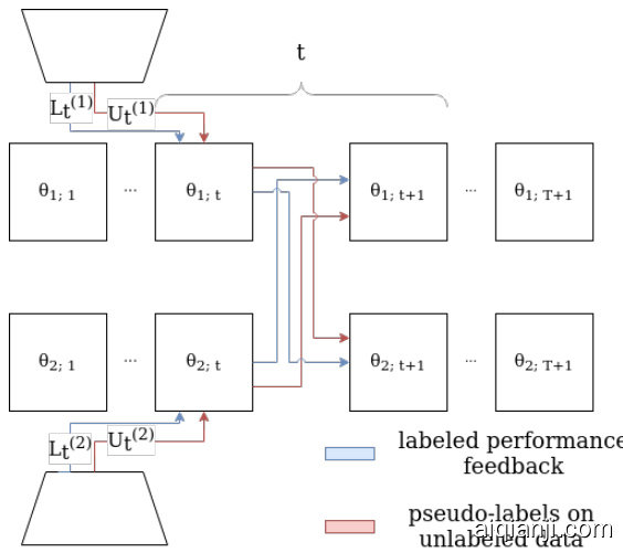 当学生模型对未标记批次进行标签预测时,它会基于教师模型提供的伪标签(该模型使用未标记实例的互补视图)产生损失,并相应调整学生模型的权重。随后,学生模型在独立的标记批次上评估其新权重的性能。该性能会向教师模型提供反馈。从几何角度理解,若这些伪标签有助于另一模型在标记集上表现更好,则参数更新方向会朝着提升伪标签置信度的方向进行;反之,若损害另一模型在标记集上的性能,则朝相反方向更新。