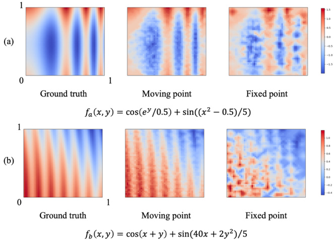 Firstly, we conducted a fitting experiment to validate that our self-moving point representation can work as an approximator for a continuous function. To do so, we used two sinusoidal-based functions as the ground truth. Given a function, SMP is optimized to represent the sampled function on a $51\times51$ grid. In this experiment, we designed SMP with 204 points. The fitting result has been shown in Fig. 3. It demonstrates that our proposed method reasonably well approximates a given continuous function with fewer points. Additionally, we compared with the fixed point representation and observed that optimizing the position of points together helps to better approximate the func- tion as the number of points is equal.
