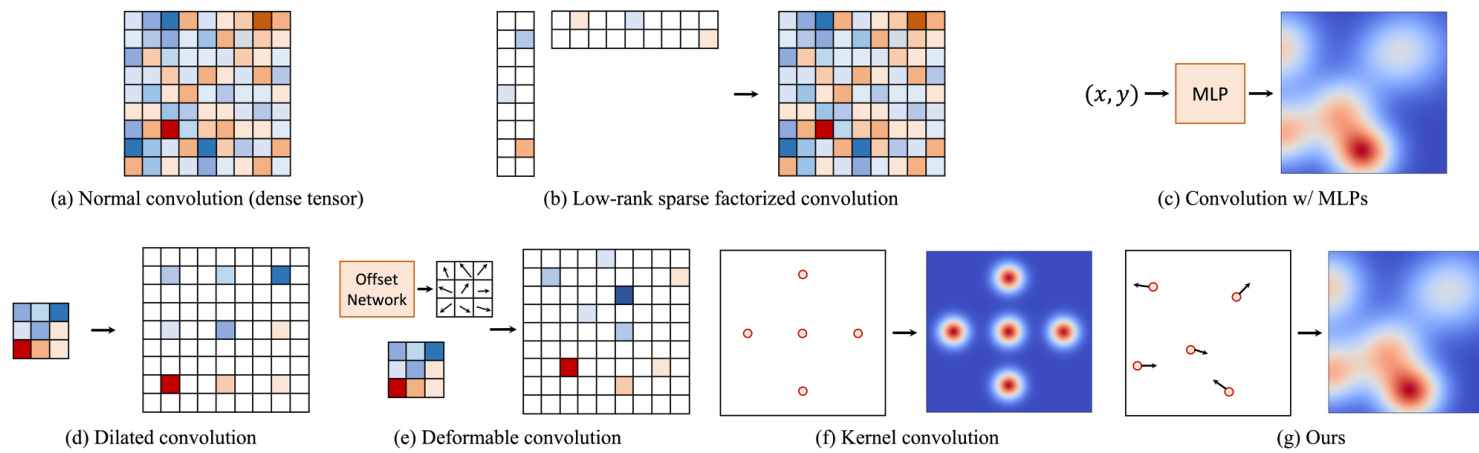 点表征 (point representations) 最近在神经场 (neural fields) 中被提出,以改善基于网格表征的缺陷,这得益于其灵活性和表达能力 [69, 75]。它们可以通过在给定查询点时插值邻近点,在连续输入域上生成输出。由于它能根据函数的复杂性(例如在低频区域使用较少的点)自适应地定位点,因此比基于网格的表征更准确且参数效率更高。尽管我们的工作很大程度上受到这些研究的启发,但 1. 我们重新利用点表征来构建连续卷积核,2. 我们不使用会增加额外建模复杂度的多层感知机 (MLP),3. 我们的方法不需要复杂的初始化(或算法)来重新定位点,例如基于深度的初始化 [69] 和基于掩码的初始化 [75]。
