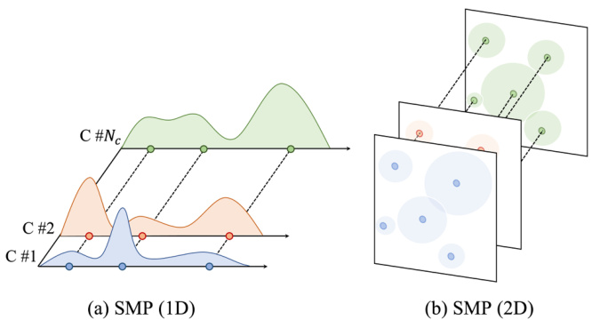 Figure 2. Self-moving point representation. (a) SMP as a function of the one-dimensional input domain, and (b) SMP as a function of the two-dimensional input domain. ‘C #1’ means the first channel. Each channel shares the location of the points, whereas each channel has its own weight parameters.