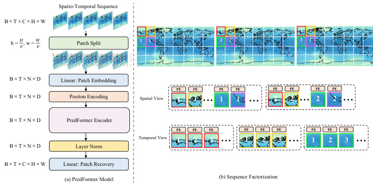 Patch Embedding. Follow the ViT design, PredFormer splits a sequence of frames $\mathcal{X}$ into a sequence of $N=$ $\left\lfloor{\frac{H}{p}}\right\rfloor\left\lfloor{\frac{W}{p}}\right\rfloor$ equally sized, non-overlapping patches of size $p$ , each of which is flattened into a 1D tokens. These tokens are then linearly projected into hidden dimensions $D$ and processed by a layer normalization (LN) layer, resulting in a tensor ′ RB×T ×N×D.