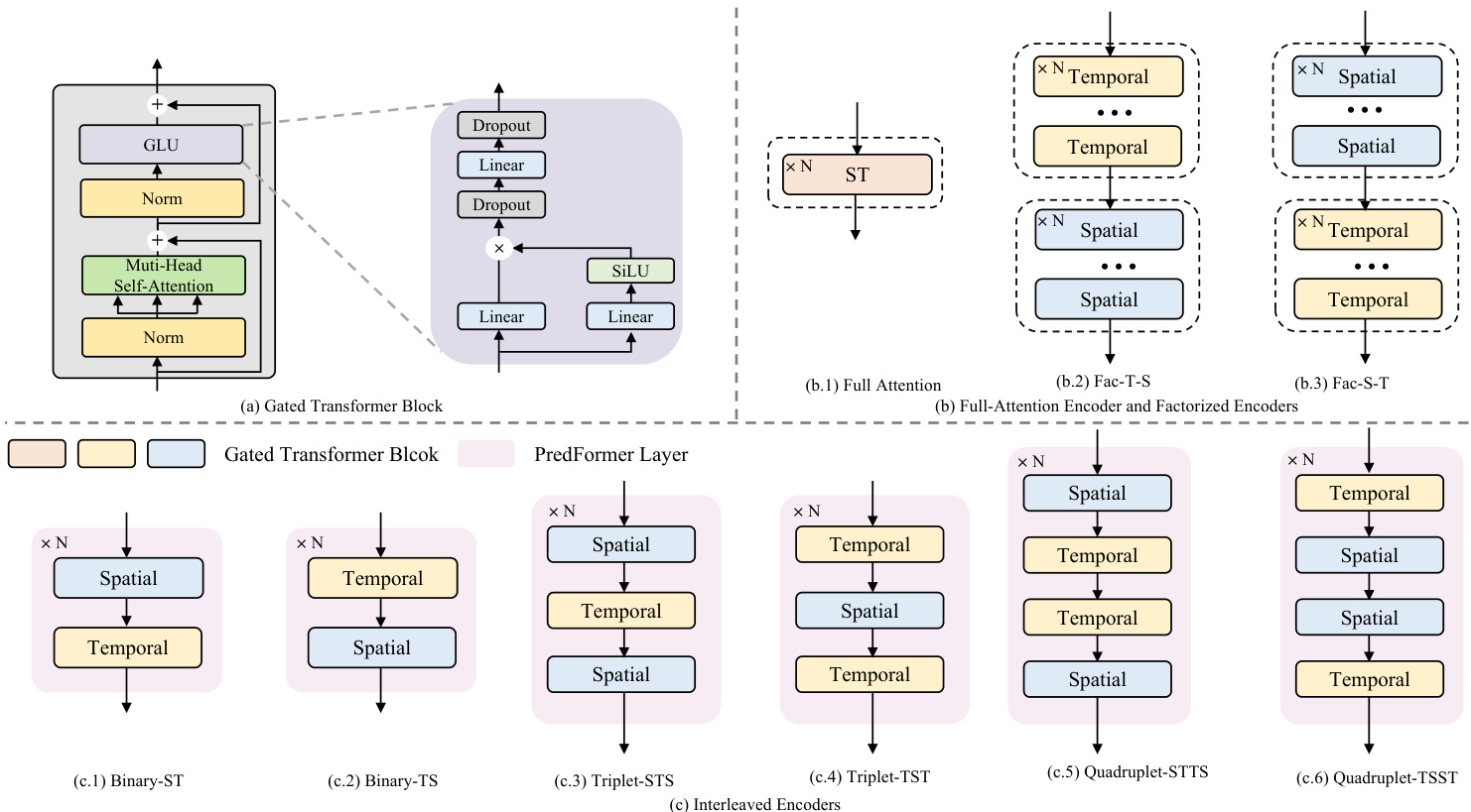 PredFormer层是一种能够同时处理空间和时间信息的模块。基于这一设计原则,我们提出了三种交错的空间-时间范式:二元(Binary)、三元(Triplet)和四元(Quadrupled),依次从空间和时间视角建模关系。