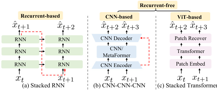 图 1: 视频预测框架的主要类别。(a) 基于循环的框架 (b) 基于CNN编码器-解码器的无循环框架。(c) 基于纯Transformer的无循环框架。