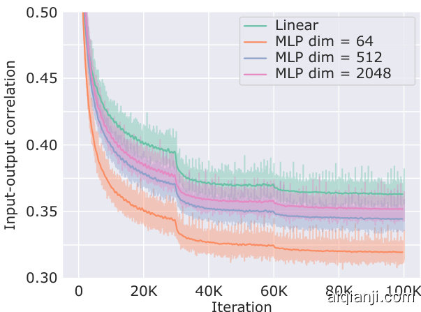 图 3: 不同投影器架构下的输入-输出特征相关性。所有被考察的投影器都会逐渐降低输入-输出特征间的相关性。