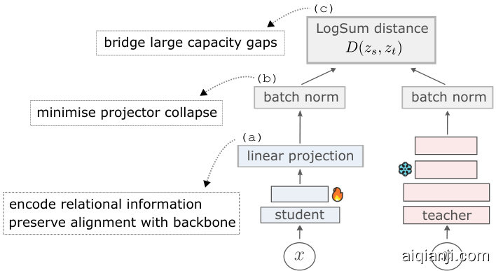 图 1: 提出的特征蒸馏流程包含三个独立组件:线性投影 (a)、批归一化 (b) 和 LogSum 距离度量 (c)。我们为这三个组件分别提供了可解释性说明,最终形成了一种高效低成本的特征蒸馏方案。