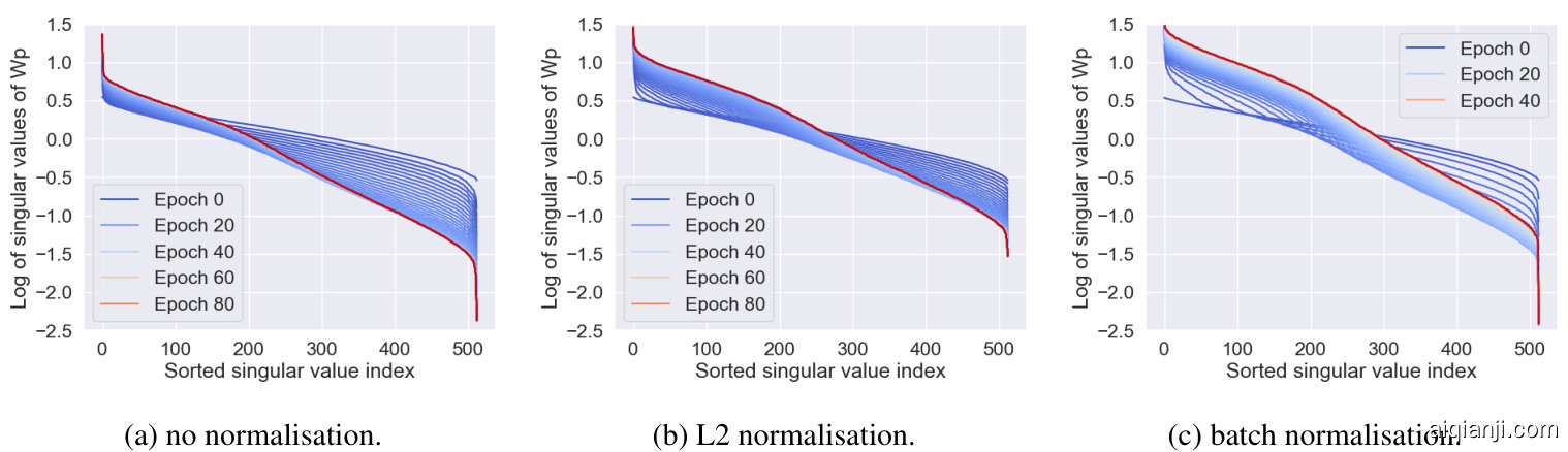 图 2: 三种不同表示归一化方案下投影权重 $\mathbf{W}_{p}$ 的奇异值演化。学生网络为ResNet-18,教师网络为ResNet-50。三条曲线分别展示了表示未经归一化、L2归一化和批归一化时投影器权重的奇异值变化情况。