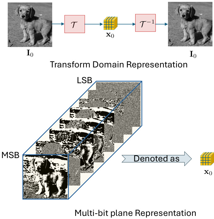Figure 1. Multi-bit plane representation of images. An image  ${\bf{I}}{0}$   is represented by  $\mathbf{x}{0}$   through a bijective transform   $\tau$  . In this work,  $\tau$  decomposes the input image into bitplanes, organized within the tensor  $\mathbf{x}{0}$  , where MSB planes capture the most significant bits and LSB planes capture the least significant bits. Notably, these representations are binary, satisfying   $\begin{array}{r}{\mathbf I_{0}=\sum_{k=0}^{n-1}\mathbf x_{0}(k)2^{k}}\end{array}$   for a gray-scale image or RGB competent of a c olor image. The MSB planes exhibit high pixel correlation, while the LSB planes display greater independence across pixels.