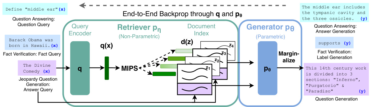 Figure 1: Overview of our approach. We combine a pre-trained retriever (Query Encoder $^+$ Document Index) with a pre-trained seq2seq model (Generator) and fine-tune end-to-end. For query $x$ , we use Maximum Inner Product Search (MIPS) to find the top-K documents $z_{i}$ . For final prediction $y$ , we treat $z$ as a latent variable and marginal ize over seq2seq predictions given different documents.