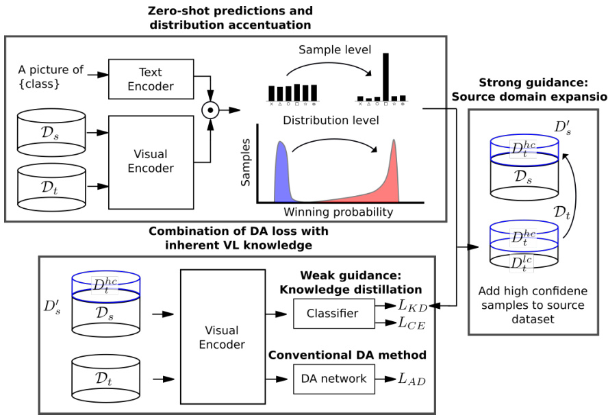 在本研究中,我们认为将这两种方法的优势相结合能取得更优效果,而非视它们为竞争关系。我们融合了视觉语言模型(Vision-Language Model)的固有知识与通过领域适应(Domain Adaptation)从源数据集迁移的知识。