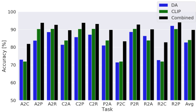 Figure 1. Accuracy on the OfficeHome dataset for unsupervised domain adaptation (blue), CLIP zero-shot predictions (green), and our combined version (black) integrating zero-shot predictions into UDA. In this work, we present a way to combine the knowledge from vision-language models with knowledge transferred via UDA from a source domain. It can be seen that the performance significantly improves.