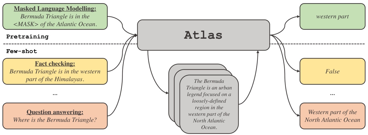 Figure 1: We introduce Atlas, a retrieval-augmented language model that exhibits strong few-shot perfor mance on knowledge tasks, and uses retrieval during both pre-training and fine-tuning.