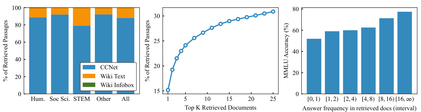 We can also analyse the content of passages to assess how they may useful for accomplishing the downstream task. The middle panel of Figure 3 shows how often retrieved documents contain the text of the correct answer option. There being at least one mention of the correct answer choice in $30%$ of test questions in the top 25 passages.6 The right panel shows that the accuracy on MMLU increases when the correct answer option text occurs more frequently in retrieved passages, rising from $55%$ for questions when the answer option does not appear, to 77% for questions mentioned more than 15 times.