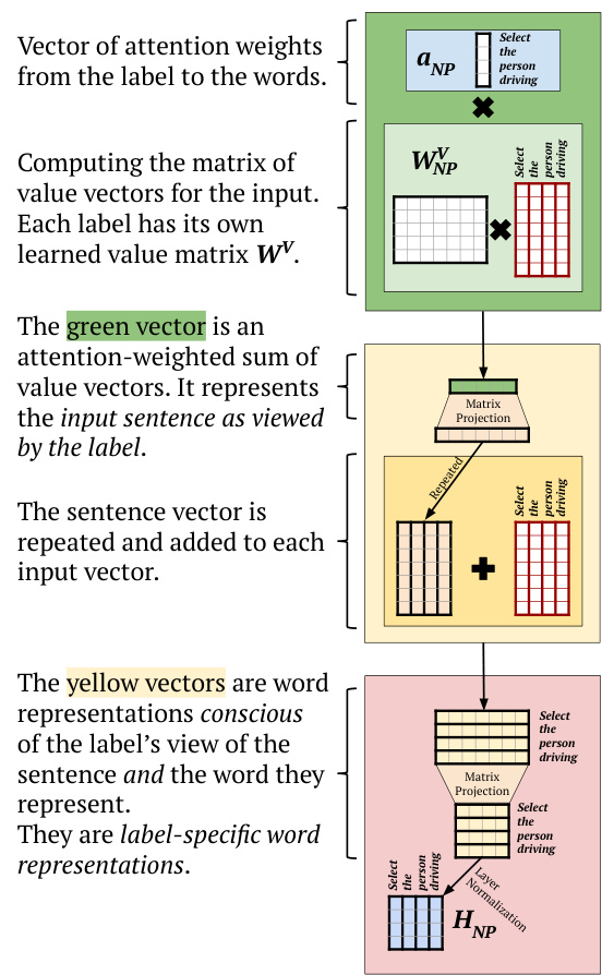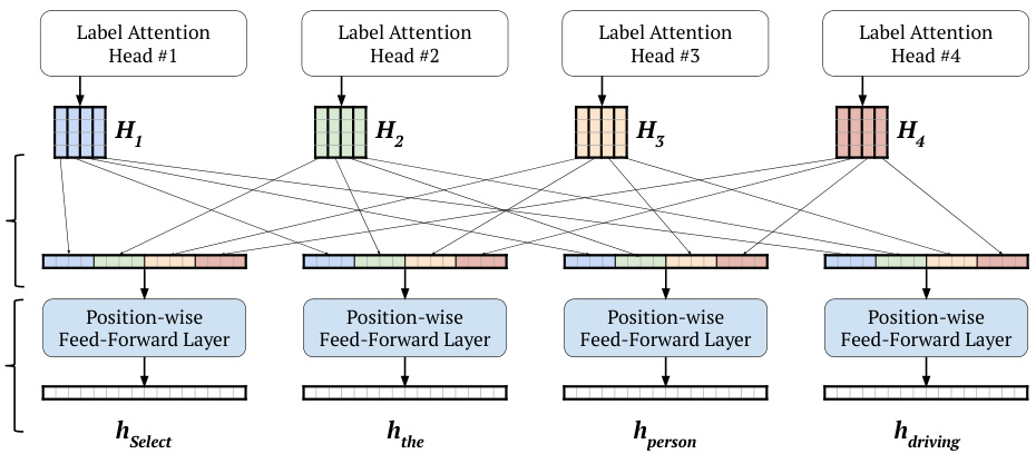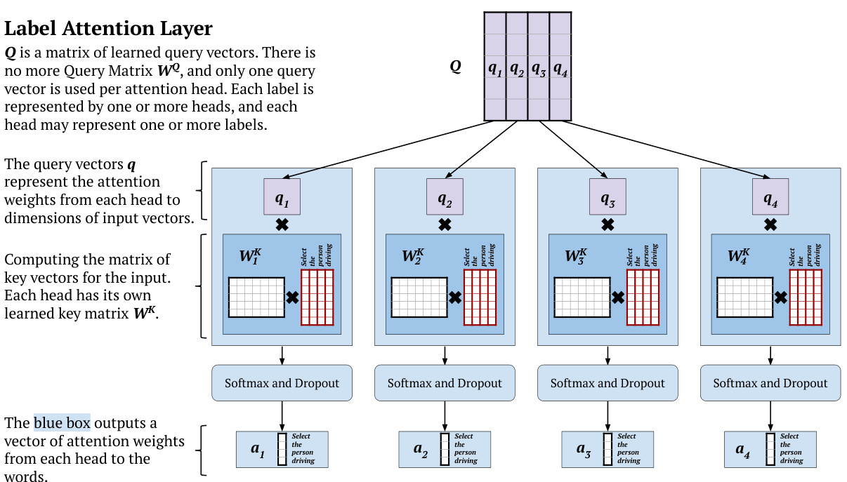图 2: 我们提出的标签注意力层 (Label Attention Layer) 顶部架构示意图。图中示例输入句子为"Select the person driving"。