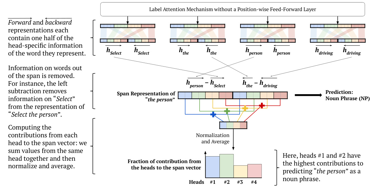 The activation functions of the position-wise feed-forward layer make it difficult to follow the path of the contributions. Therefore we can remove the position-wise feed-forward layer, and compute the contributions from each label. We provide an example in Figure 6, where the contributions are computed using normalization and averaging. In this case, we are computing the contributions of each head to the span vector. The span representation for “the person” is computed following the method of Gaddy et al. (2018) and Kitaev and Klein (2018). However, forward and backward representations are not formed by splitting the entire word vector at the middle, but rather by splitting each head-specific word vector at the middle.