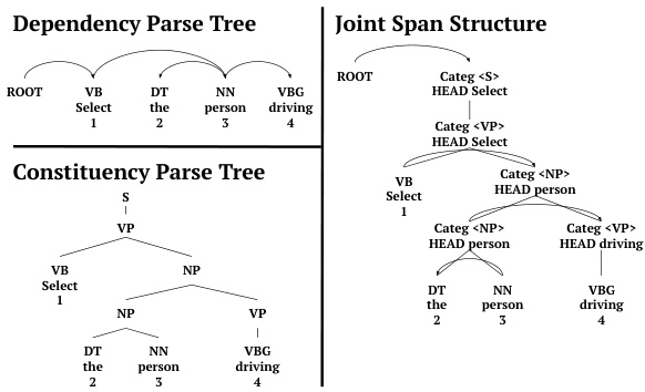 Figure 5: Parsing representations of the example sentence in Figure 2.