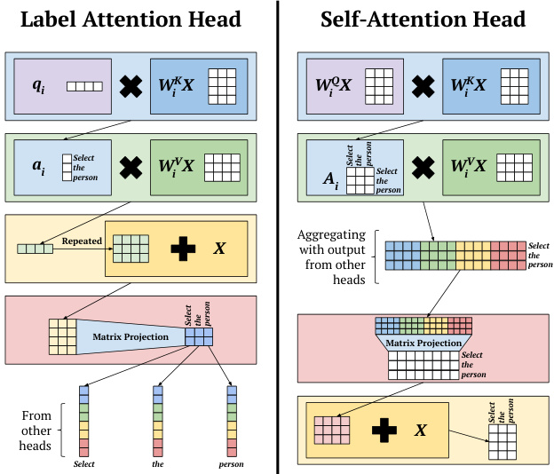 Figure 1: Comparison of the attention head architectures of our proposed Label Attention Layer and a SelfAttention Layer (Vaswani et al., 2017). The matrix   $\mathbf{X}$  represents the input sentence “Select the person”.