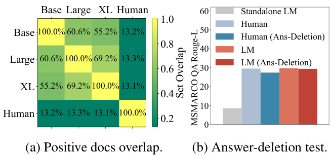 Figure 6: Analysis of LM-preferred documents. (a) shows the overlaps of positive document sets, where used LMs are Flan-T5 series. (b) presents the answerdeletion experiments on the MSMARCO QA dataset. The retriever is initialized from ANCE.