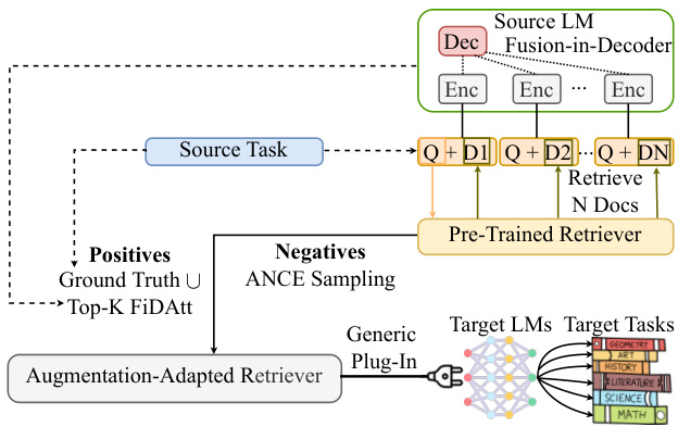 Specifically, we choose a small encoder-decoder LM as the source LM and utilize its fusionin-decoder attention scores (Izacard and Grave, 2021a) to annotate LM-preferred documents. The LM-preferred documents are then combined with human-preferred documents to form the positive document set. Negative documents are mined by the retriever itself using the ANCE (Xiong et al., 2021) technique. After fine-tuning the retriever with LM’s preferences, it can directly assist unseen target LMs in the zero-shot task generalization.
