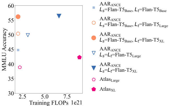 LM Flan-$\mathrm{T5_{Base}}$ (250M) to provide training signals and can generalize well to target LMs of larger capacities. Figure 3 illustrates that solely setting the source LM as the target LM (represented by the inverted triangles) does not significantly enhance the MMLU accuracy. However, it may triple the training budget required. Only using a small source LM is able to outperform the powerful Atlas by large margins with fewer training FLOPs.