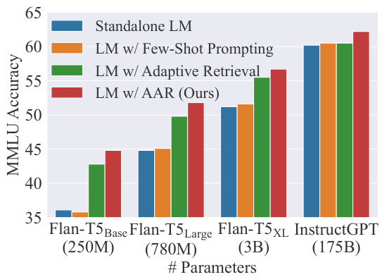 We evaluate AAR on a multi-task language understanding dataset MMLU (Hendrycks et al., 2021) and an entity-centric question answering dataset PopQA (Mallen et al., 2022). For the target LMs, we choose Flan-T5 (Chung et al., 2022) series as our backbone for encoder-decoder LMs and Instruct GP T (Ouyang et al., 2022) as our backbone for decoder-only LMs. Figure 1 shows that assisted with a generic AAR, LMs of different sizes and architectures can consistently outperform the standalone LMs; the performance of smaller LMs can sometimes surpass the standalone counterparts of significantly larger sizes (e.g., Flan-T5Large w/ AAR outperforms standalone Flan $.\mathrm{T}5_{\mathrm{XL}}$ by $0.6%$ ). AAR also demonstrates advantages over other augmentation approaches such as few-shot prompting and adaptive retrieval (Mallen et al., 2022).