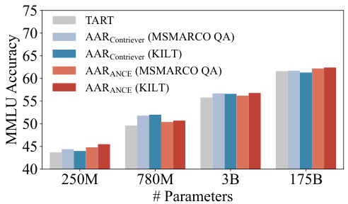 Retrievers. We adopt two widely used retrievers to initialize AAR: ANCE initialized from $\mathrm{T}5_{\mathrm{Base}}$ (Raffel et al., 2020; Ge et al., 2023) and Contriever (Izacard et al., 2021) initialized from $\mathrm{BERT_{Base}}$ (Devlin et al., 2019). Both of them have been fine-tuned on MS MARCO (Bajaj et al., 2016) previously. For the retrieval corpus, we choose the MS MARCO (Bajaj et al., 2016) for MMLU and the KILT-Wikipedia (Petroni et al.) for PopQA.