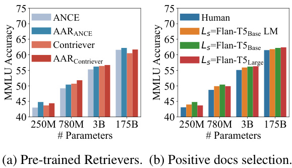 In Figure 4b, we compare retrievers trained with different positive documents, including humanpreferred documents annotated by search users (the blue bar), LM-preferred documents obtained by the source LM (the orange bar), and their combinations (the green bar and the red bar). Since the retriever has been pre-trained on user-annotated MS MARCO, simply using human-preferred documents to train it may be meaningless and therefore performs the worst among all approaches. Only using LM-preferred documents demonstrates notable gains over only using human-preferred documents, and merging both human-preferred and LM-preferred documents (our main setup) further enhances the retriever’s performance. Finally, using Flan- $\mathrm{T5}_{\mathrm{Base}}$ as source LM yields better results compared to using Flan-T5Large when the target LMs are relatively small. However, as the target LM’s size increases, both approaches achieve comparable performance. Hence, our choice to utilize a small source LM in the augmentation-adapted training is reasonable and effective.