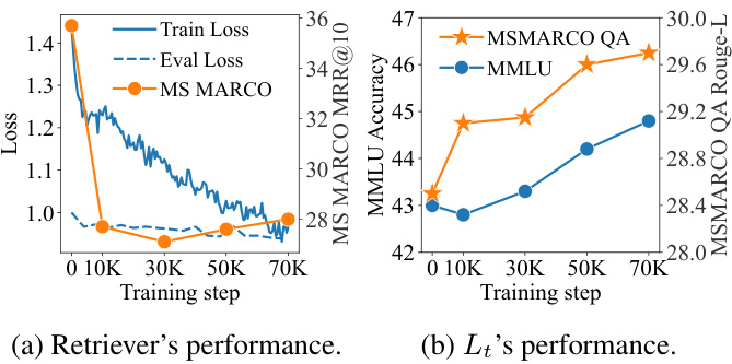 Figure 5: AAR’s training process. (a) exhibits the retriever’s (ANCE) performance on MS MARCO. (b) presents the   $L_{t}$  ’s (Flan $\cdot\mathrm{T}5_{\mathrm{Base}}$  ) performance on MSMARCO QA and MMLU.
