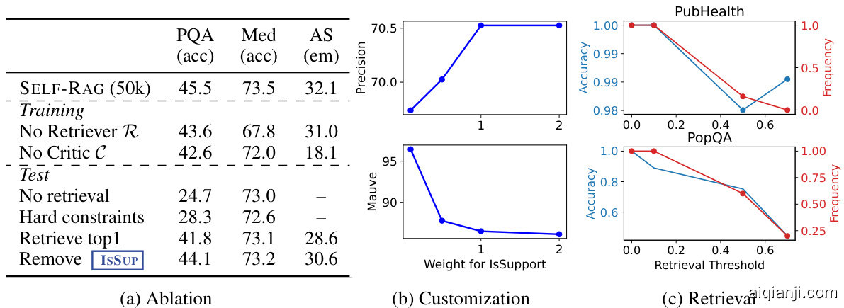图 3: SELF-RAG分析: (a) 基于7B模型对SELF-RAG训练和推理关键组件的消融研究。 (b) 软权重对ASQA引用精确率和Mauve(流畅度)的影响。 (c) PubHealth和PopQA上的检索频率和归一化准确率。