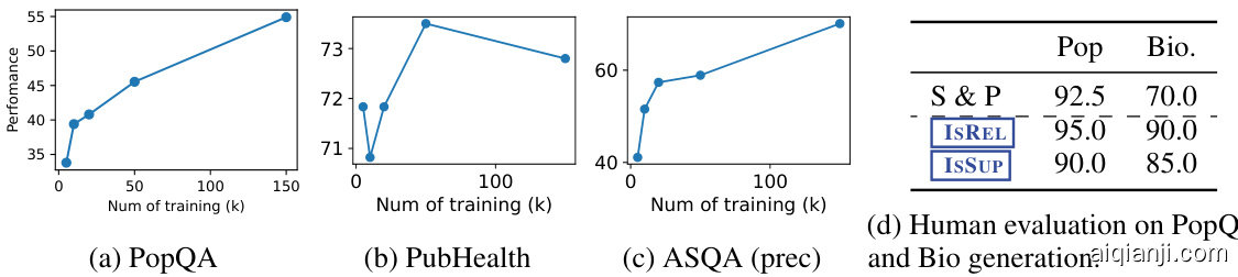 Effects of training data size. We conduct an analysis of how the data scale affects the model’s performance. In particular, we randomly sample 5k, 10k, $20\mathrm{k\Omega}$ , and $50\mathrm{k\Omega}$ instances from our original $150\mathrm{k}$ training instances, and fine-tune four SELF-RAG $7\mathrm{B}$ variants on those subsets. Then, we compare the model performance on PopQA, PubHealth, and ASQA (citation precision) with our final SELFRAG trained on the full $150\mathrm{k}$ instances. We also evaluate Figures 4a, 4b and 4c shows the models’ performance trained on different amount of data. Across all datasets, increasing data size often shows upward trajectories and the improvements are significantly larger in PopQA and ASQA, while we do not observed such significant improvements on $\mathrm{Llama2-FT_{7B}}$ when increasing the training data from $50\mathrm{k\Omega}$ to $150\mathrm{k}$ . These results also indicate that further expanding the training data of SELF-RAG may lead to further improvements, although in this work we limit our training data size to 150k.