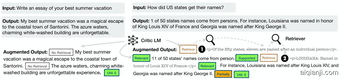 • 按需检索 (Retrieve):给定输入和上一步生成内容(如适用),大语言模型判断后续内容是否需要事实依据。No表示无需检索,因为序列不需要事实依据或知识检索可能无法提升效果;Yes表示需要检索。我们还设置了继续使用证据选项,表示模型可以继续使用先前检索到的证据。例如,某段落可能包含丰富的事实信息,因此SELF-RAG会基于该段落生成多个片段。