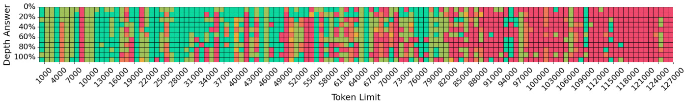 图 2: gpt-4-1106-preview 在《哈利·波特》数据集上的表现,x轴: 以文档中每 $1,000$ 个token为间隔,y轴: 表示答案在文档中的深度。颜色越绿表示性能越好。图片基于 Gregory 仓库 [18]。