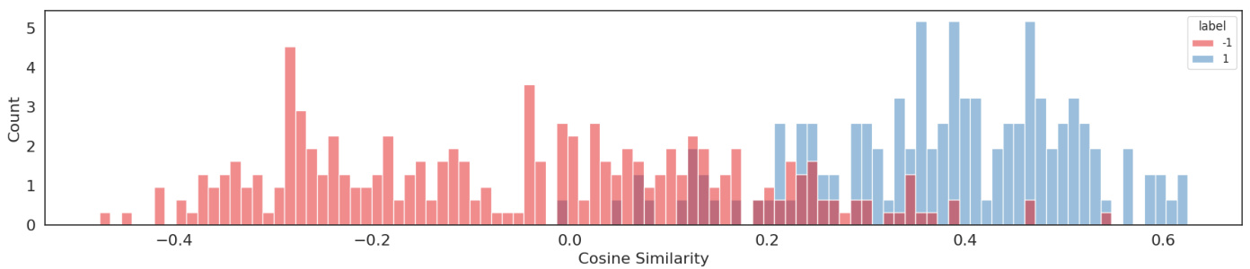 图 6: ADA-002嵌入中正负类别的余弦相似度;注意类别间存在显著重叠。测试准确率(训练前): $69.5%$