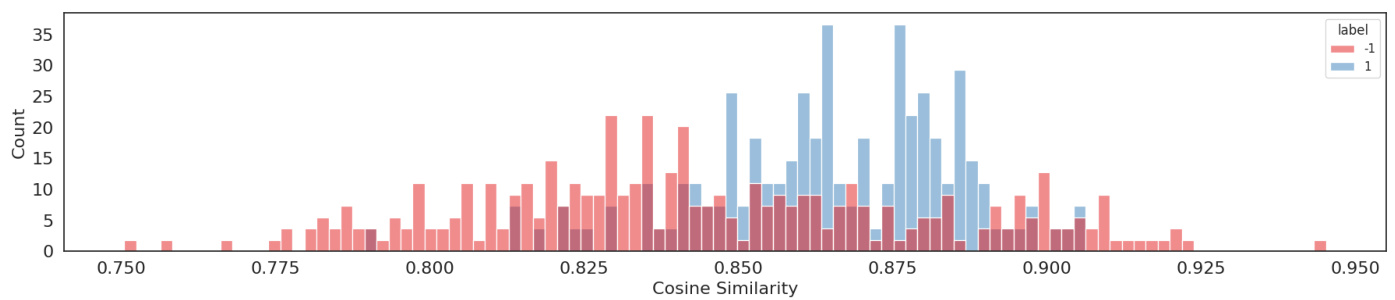 Figure 6: Cosine similarity of positive and negative classes in the ADA-002 embedding; note the significant overlap between the classes. Test accuracy (before training): $69.5%$