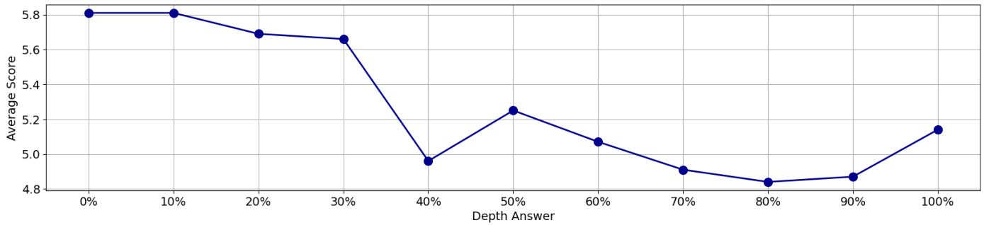 尽管配置了所有种子并重复使用提示词,我们数据中的相对最大值仍约为7.4个平均点。这表明,即使采用完美的检索策略,RAG系统也无法通过这些大语言模型在该数据集上获得满分。