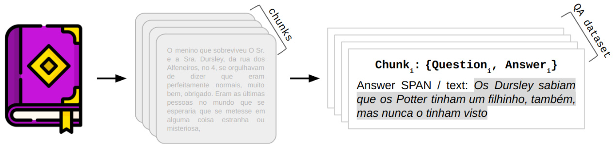 Figure 1 shows the data preparation process. Initially, the dataset was break into chunks with 1000 tokens each, without overlapping, resulting in 140 chunks. Then, using the prompt described in Appendix A, a ${q u e s t i o n,a n s w e r}$ pair was created for each chunk in the style of the SQuAD dataset [6], meaning that the answer to the question is present within the reference text (chunk).