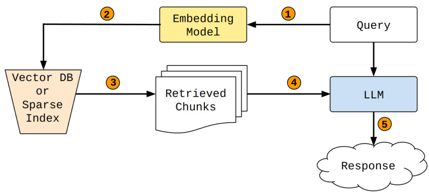 Figure 4: 1. Pass the query to the embedding model to represent its semantics as an embedded query vector; 2. Transfer the embedded query vector to vector database or sparse index (BM25); 3. Fetch the top $\boldsymbol{\cdot}\mathbf{k}$ relevant chunks, determined by retriever algorithm; 4. Forward the query text and the chunks retrieved to Large Language Model (LLM); 5. Use the LLM to produce a response based on the prompt filled by the retrieved content.