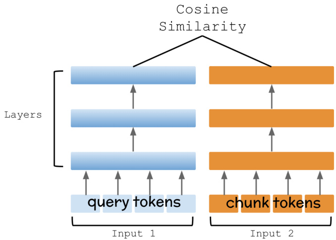 OpenAI does not disclose extensive details about the ADA-002 architecture; however, we employed this model in retrieval as the presented bi-encoder design (Figure 5): vector representations were constructed for all available chunks, and for each input query, its embedding was computed at search time. Subsequently, the similarity between the question and chunk were assessed using cosine similarity.