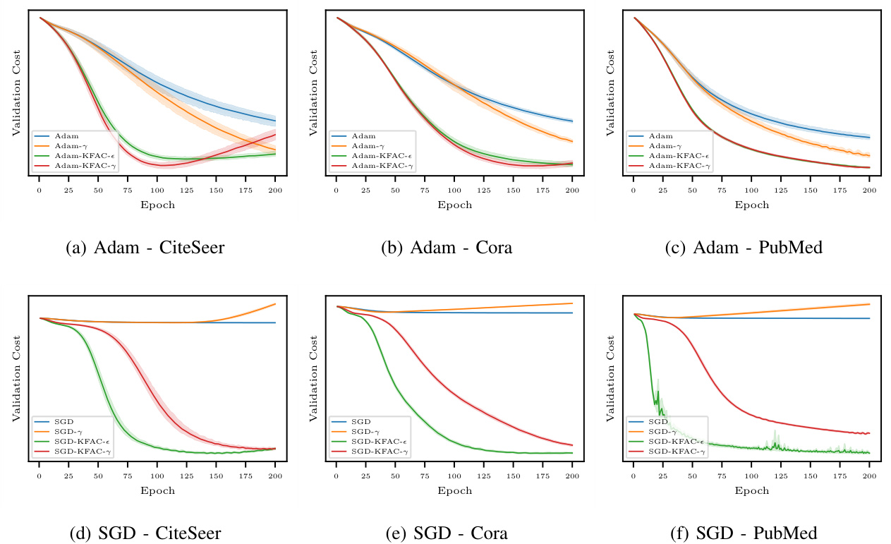 Fig. 1. The validation costs of four optimization methods on the second split of Citation datasets over 10 runs. A 2-layer GCN with a 64-dimensional hidden variable is used in all experiments. As shown in Fig. 1a, 1b, and 1c (upper row), the proposed Adam-KDAC methods (green and red curves) outperform vanilla Adam methods (blue and orange curves) on all three datasets. Also, Fig. 1d, 1e, and 1f (bottom row) reveal that the suggested SGD-KFAC methods (green and red curves) achieve a remarkably faster convergence than the vanilla SGD method (blue and orange curves) on all three datasets.