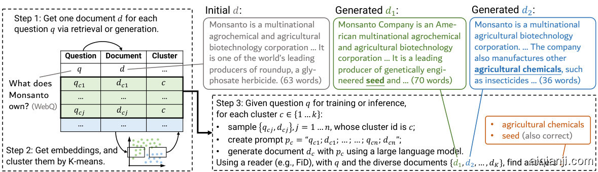 - 我们提出了一种基于聚类的新型提示方法,用于生成多个多样化的上下文文档,从而提高覆盖正确答案的可能性。实验证明该方法能显著提升端到端问答及其他下游任务的性能。