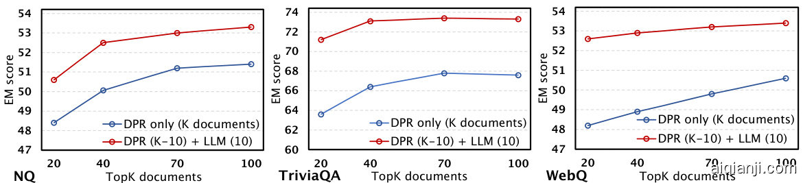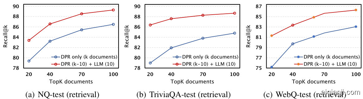 图 5: 对图 3 实验的补充检索性能评估,结合 DPR 检索文档与大语言模型生成文档的效果。合并两种来源的文档比仅使用 DPR 检索文档获得了显著更好的性能。