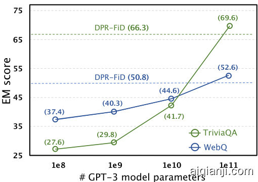 Figure 4 shows the scaling of performance with InstructGPT generator parameters, including Ada-150M, Babbage-1.3B, Curie-6.7B and Davinci-175B. We note that for both FiD and our GENREAD , we use the FiD-xl with 10 input documents either retrieved from Wikipedia or generated by Instruct GP T. The performance of both TriviaQA and WebQ continues to improve as the generator model parameters increase, as does the slope. Only with the largest size Instruct GP T, GENREAD can outperform the DPR-FiD. This indicates using large language model to generate contextual documents is an “emergent ability” of scaling, which is not present in smaller models but is only present in larger language models (Wei et al., 2022a).