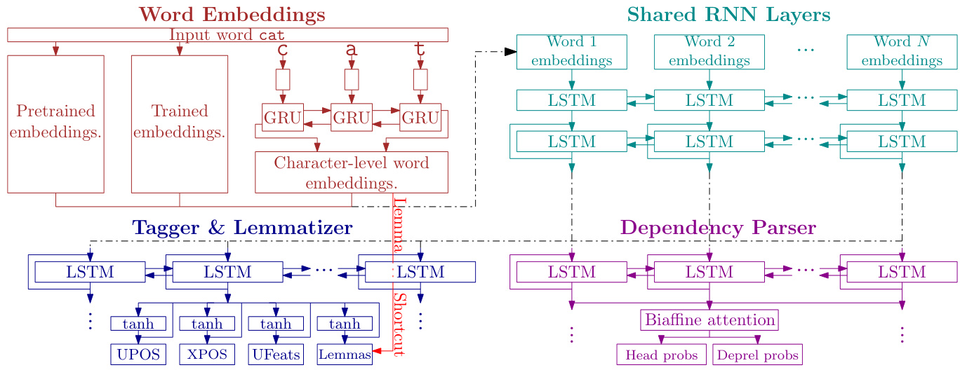 Finally, the output of the two shared LSTM layers is processed by a parser specific bidirectional LSTM layer, whose output is then passed to a biaffine attention layer (Dozat and Manning, 2016) producing labeled dependency trees. We refer the readers for detailed treatment of the architecture and the training procedure to Straka (2018).
