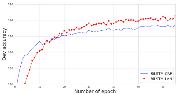 Training vs CRF. Figure 3 presents the training curves on the WSJ development set. At the beginning, BiLSTM-LAN converges slower than BiLSTM-CRF, which is likely because BiLSTMLAN has more complex layer structures for label embedding and attention. After around 15 training iterations, the accuracy of BiLSTM-LAN on the development sets becomes increasingly higher than BiLSTM-CRF. This demonstrates the effect of label embeddings, which allows more structured knowledge to be learned in modeling.