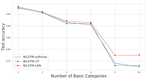 Super category Complexity. We also measure the complexity of super categories by the number of basic categories that they contain. According to this definition, “S”, “S/NP” and “(S \NP)/NP” have complexities of 1, 2 and 3, respectively. Figure 5 shows the accuracy of BiLSTM-softmax, BiLSTM-CRF and BiLSTM-LAN against the supertag complexity. As the complexity increases, the performance of all the models decrease, which conforms to intuition. BiLSTM-CRF does not show obvious advantages over BiLSTM-softmax on complex categories. In contrast, BiLSTMLAN outperforms both models on complex categories, demonstrating its advantage in capturing more sophisticated label dependencies.