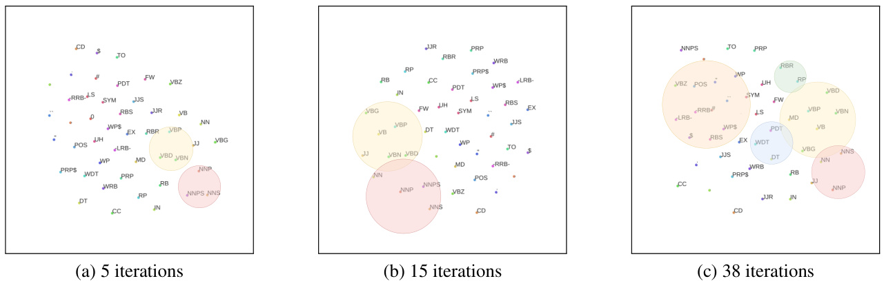 可视化。LAN的一个显著优势是模型更具可解释性。我们对词性标注任务中的标签嵌入和标签注意力权重进行了可视化。使用t-SNE技术,我们分别在5次、15次和38次训练迭代后将45种不同的英语词性标签(WSJ)映射到二维平面上。每个点代表一个标签嵌入。如图4所示,随着训练进行,标签嵌入逐渐呈现出更有意义的分布。初始阶段,向量在空间中随机分布;经过5次迭代后,开始形成小型聚类簇,例如"NNP"与"NNPS"、"VBD"与"VBN"、"JJS"与"JJR"等;随着训练迭代增加,这些聚类簇会吸收更多相关标签。完成38次训练迭代后,大多数相似词性标签(如"VB"、"VBD"、"VBN"、"VBG"和"VBP")已聚集在一起。更多注意力可视化结果见附录B。